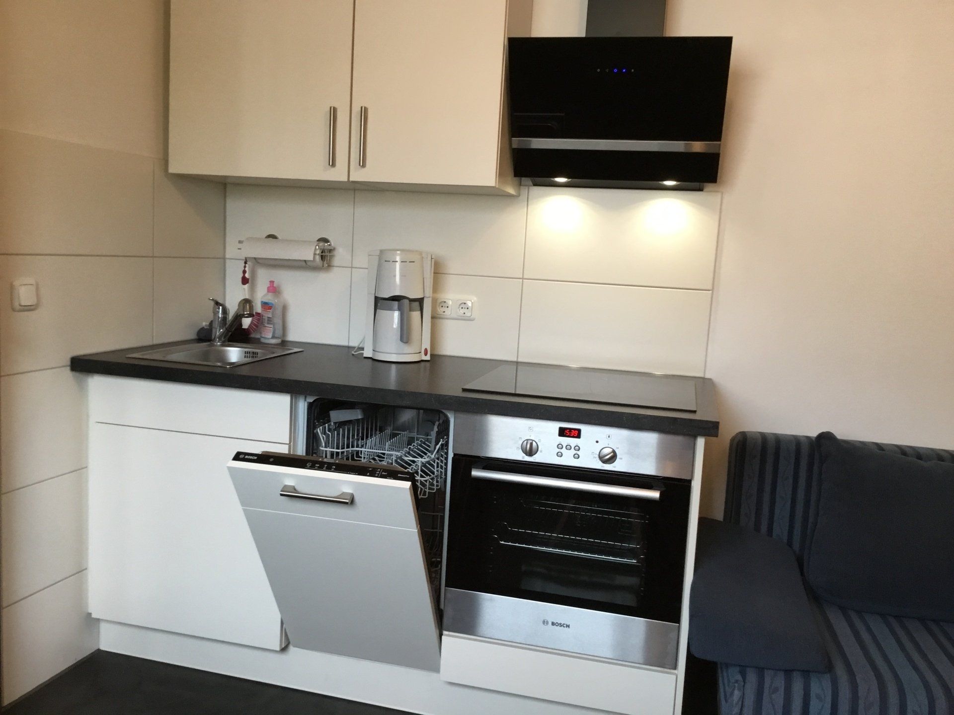 Schlafsofa als Zusatzbett ( 152 cm X 200 cm) möglich, integrierte Küche mit Tisch und Sitzgelegenheit für 2 Personen.